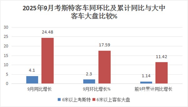 2025年9月考斯特客车销量同比增长4.1%,跑输今年9月6米以上客车大盘24.48%的同比增速近20.38个百分点;