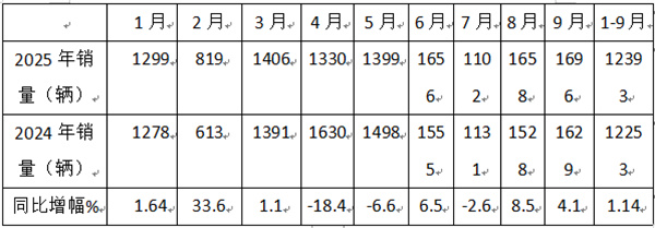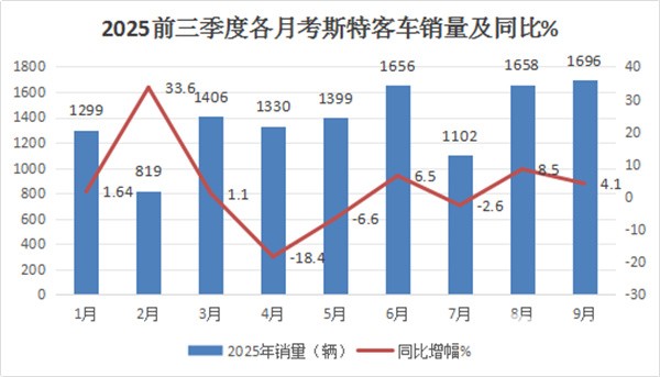 表1,根据终端上牌数据,2025年1-9月各月考斯特客车销量: