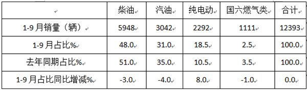 表2,根据终端上牌数据统计,按燃料种类划分,2025年前三季度考斯特客车销量结构及占比同比增减: