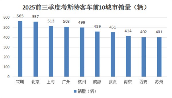 上图可见,深圳、北京、上海是今年前三季度国内考斯特客车销量前三城市,且销量均超500辆;广州第四,销量也超500辆(508辆);其余城市销量均咋500辆以下。