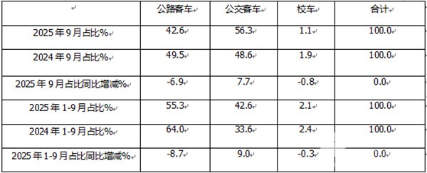 2025年9月及1-9月5米以上客车三大细分市场占比呈现以下特点: