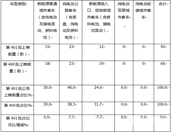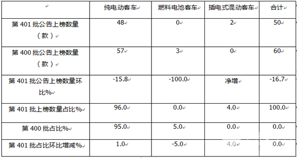 表4,根据第401批公告数据,按目标用途划分上榜的款新能源客车车型类别结构占比及占比环比增减统计:
