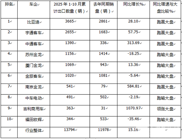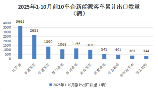 上图表显示,在2025年1-10月新能源客车累计出口前10车企中: