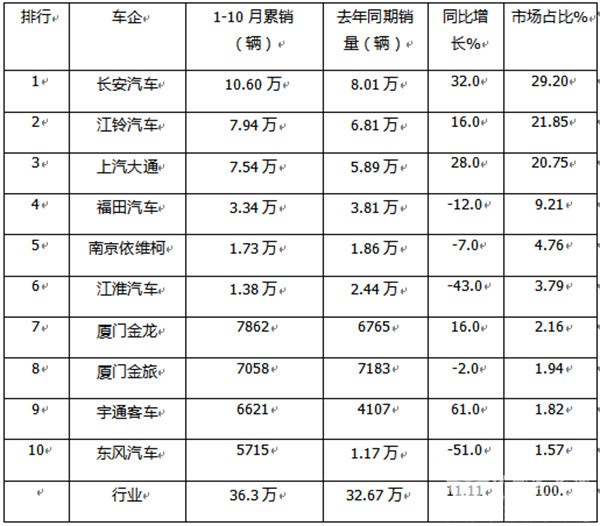 特点六、前10月累销:长安领跑;江铃、大通分列二、三;TOP10同比5增5降,宇通领涨