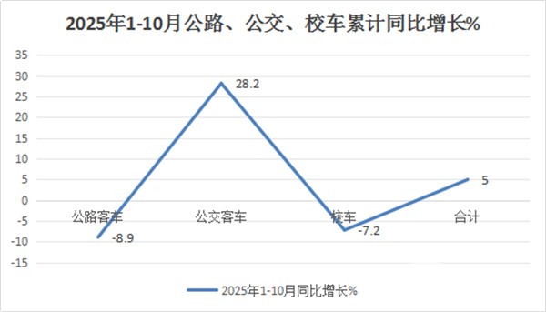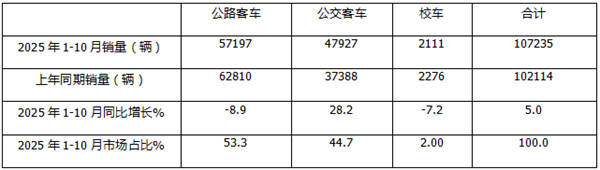 上图表可见,在2025年1-10月5米以上公路、公交、校车三大细分市场中: