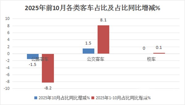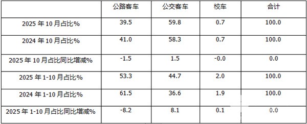 2025年10月及1-10月5米以上客车三大细分市场占比呈现以下特点: