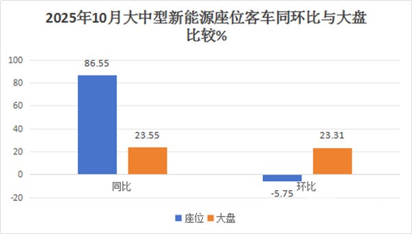 根据中国客车统计信息网数据,2025年10月我国大中型新能源座位客车同环比分别增长86.55%和-5.75%,而2025年10月大中型新能源客车大盘同环比增速分别为23.56%和23.31%,可见今年10月大中型新能源座位客车同环比增速均分别跑赢和跑输新能源客车大盘。