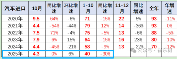 截图1:2025年前10月及10月我国汽车进口数量及同比(数据来源:中国汽车流通协会)