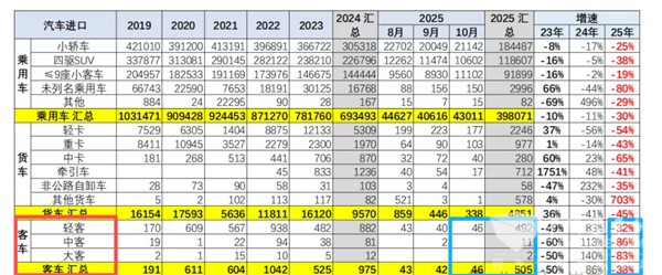 2025年1-10月我国客车累计进口505辆,同比(去年同期累计进口820辆)下降38%,跑输今年1-10月我国整个汽车进口大盘(-30%)。