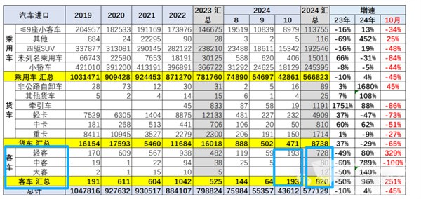 截图5,2024年10月及1-10月各种动力客车进口数量(数据来源:中国汽车流通协会)