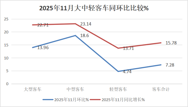 从占比看,大、中、轻客车占据2025年11月客车总销量的比例分别为11.65%、12.21%和76.14%;