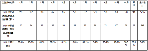 据统计,2025年工信部共计发布12个批次(第391批—第402批,下同)的新能源客车新品公告,累计上榜了566款新能源客车新品车型(含524款纯电动客车、23款燃料电池客车和19款插电式混动客车),比去年同期的549款增长3.1%。