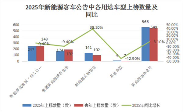 总之,在2025年新能源客车新品公告上榜的各用途车型中,低入口(低地板)居榜首,公路客车增长近4成领涨。