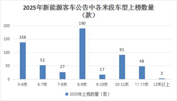 根据工信部数据,2025年新能源客车新品公告中各米段车型累计上榜数量统计: