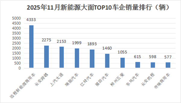 上图显示,在2025年11月新能源轻客中的大面车型销量中,远程以4333辆销量的绝对优势居榜首,长安跨越及上汽大通销量均超2000辆(分别销售2275辆和2153辆),分别居第二、第三。其余车企销量均在2000辆以下。