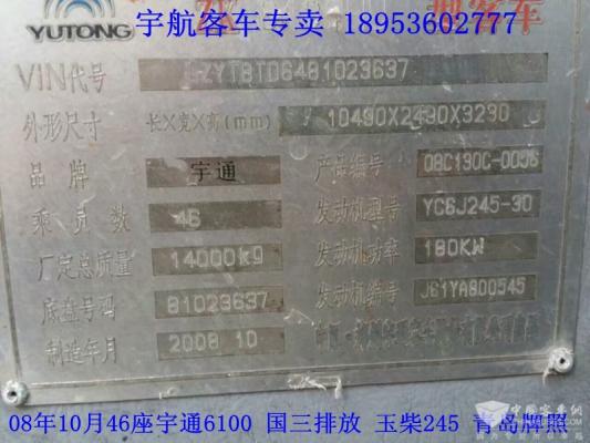 低价出售08年10月46座宇通6100,国三排放,玉柴245马力,青岛牌照。通勤车首选