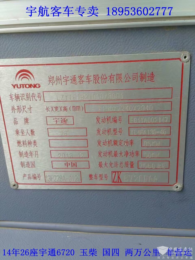 当前位置: XINGKONG.COM > 二手 > 卖二手车 > 14年26座宇通6720,国四排放,玉柴4缸130马力,行驶两万公里,非营运