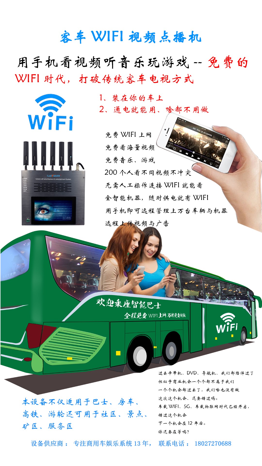 本设备不是大家网上看到的车载WIFI那样的普通产品,车载WIFI只是在路由器上面稍做改动供车载使用,其性能,带机量,读取速度,以及解码能力都是有限的。本系统与普通的车载WIFI区别在于在总带机量100台的情况下,所有终端秒开视频,设备集成了最新的MU-MIMO技术,与普通的车载WIFI相比,相当于二车道与八车道,车载WIFI的解码是靠路由器CPU来处理终端访问的数据,大家知道,路由器CPU与电脑的CPU相比差距较大,而JT1850系统是使用工业级服务器CPU来处理数。