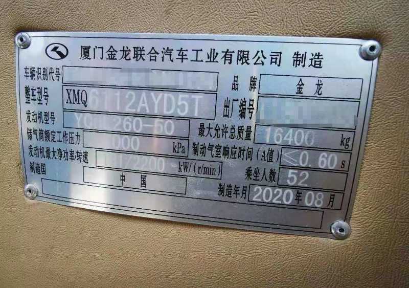 金龙6112型 2020年8月 52座 非营运 车况新 好 价格优惠