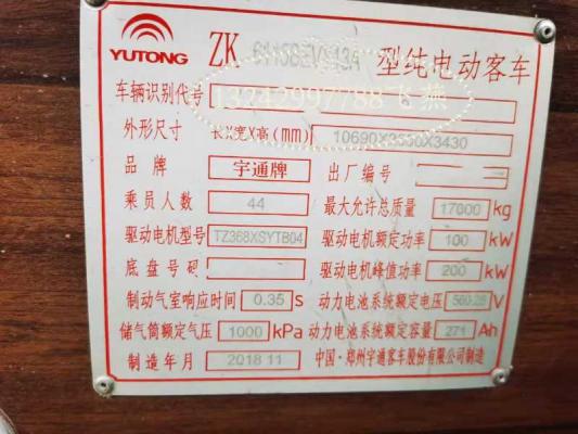| 客车品牌 | 宇通客车 | 上牌时间 | 2018-12-27 |