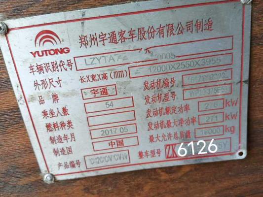 12米国五54座2017年7月上牌宇通6126气囊车,54座,双门(后门),超大行李舱,潍柴P10-375国五发动机,上移行李舱,四轮碟刹免维护,有暖气,司机卧铺,公路客运,可提供广东省营运转籍通知单,新换电瓶,前轮胎八九成,看车请电话