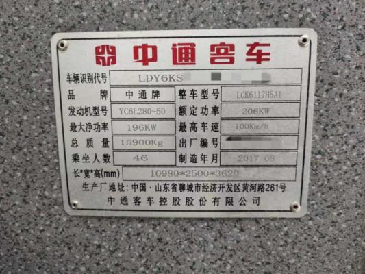 | 客车品牌 | 中通客车 | 上牌时间 | 2017-09-29 |