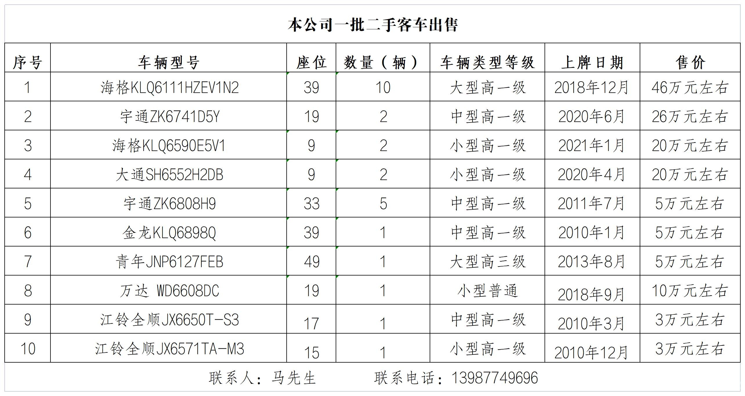 本公司一批二手客车出售,有意联系:13987749696(马先生)
