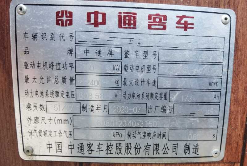 | 客车品牌 | 中通客车 | 上牌时间 | 2020-12-26 |