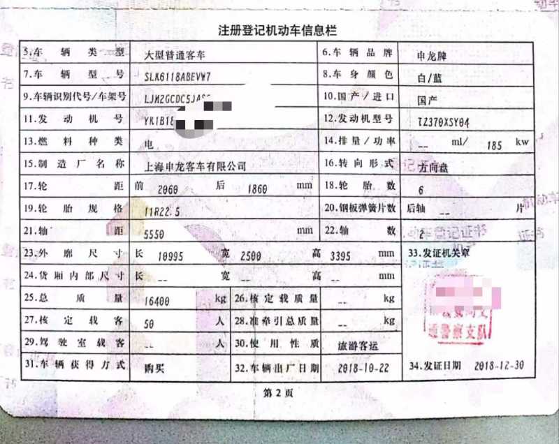 | 客车品牌 | 申龙客车 | 上牌时间 | 2018-12-13 |