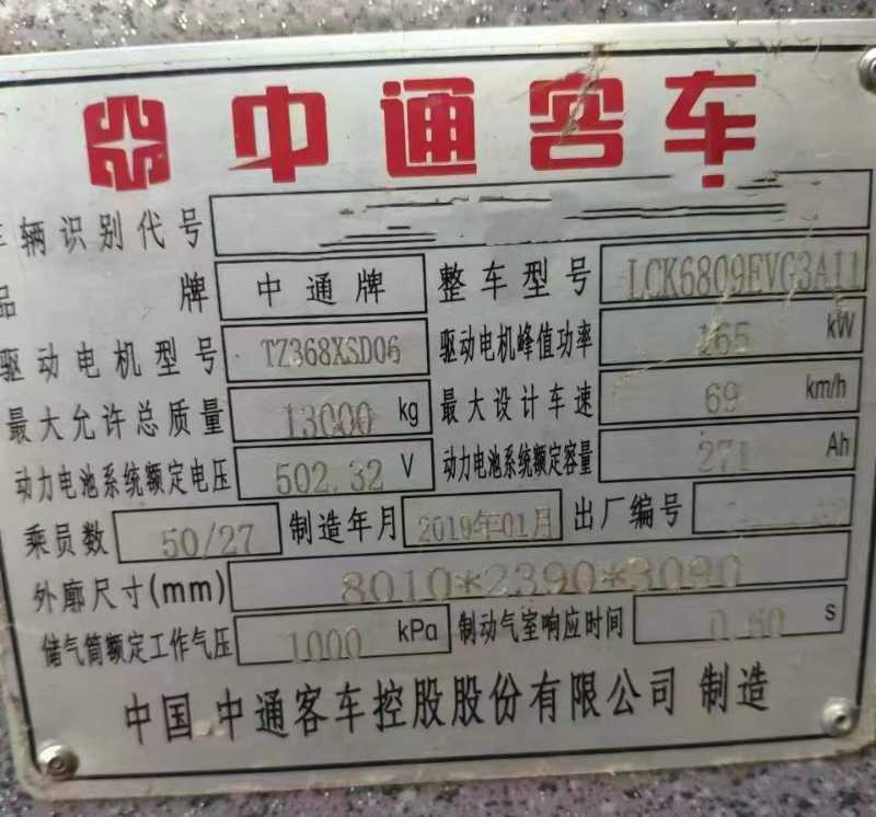 | 客车品牌 | 中通客车 | 上牌时间 | 2019-01-15 |