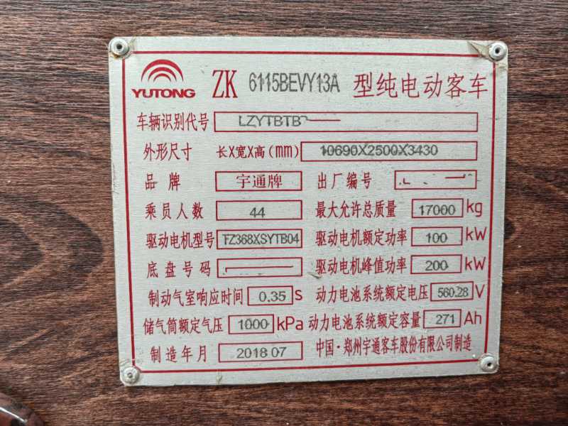 2018年7月 44座非营运宁德时代有电池加热宇通气囊电车