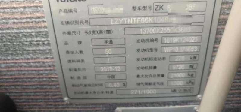 | 客车品牌 | 宇通客车 | 上牌时间 | 2019-12-04 |
