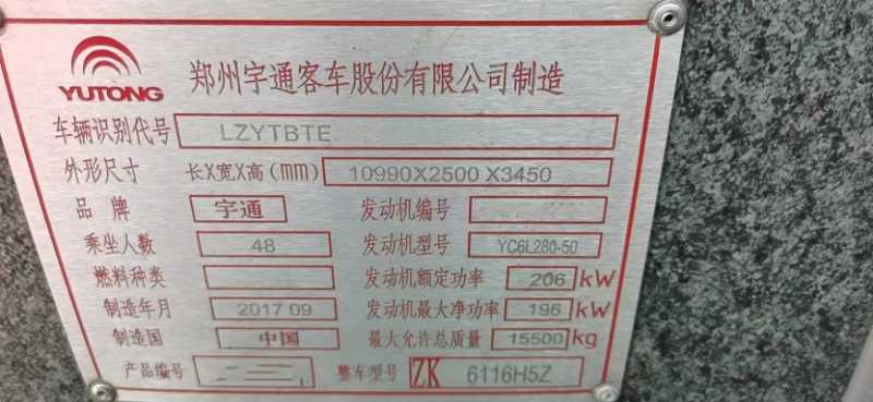 | 客车品牌 | 宇通客车 | 上牌时间 | 2017-10-11 |