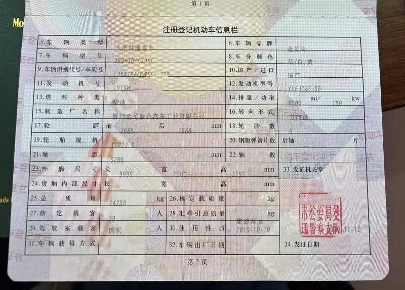 | 客车品牌 | 金龙客车 | 上牌时间 | 2019-11-13 |