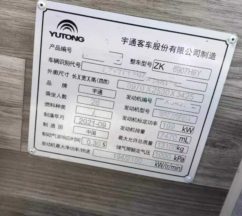 | 客车品牌 | 宇通客车 | 上牌时间 | 2021-10-19 |
