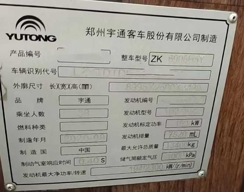 | 客车品牌 | 宇通客车 | 上牌时间 | 2020-09-16 |