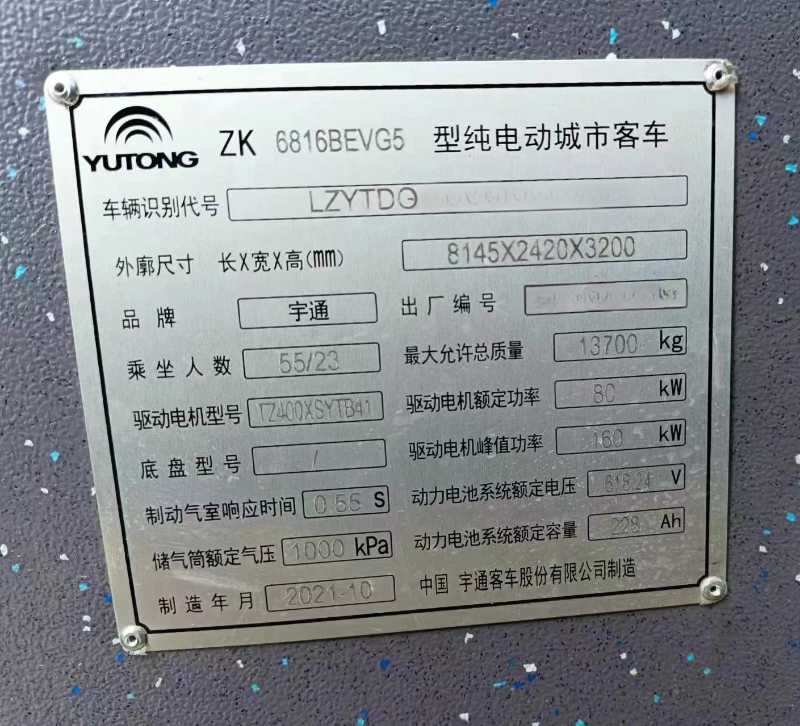 | 客车品牌 | 宇通客车 | 上牌时间 | 2021-12-16 |