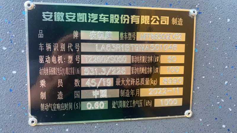 | 客车品牌 | 安凯客车 | 上牌时间 | 2022-12-07 |