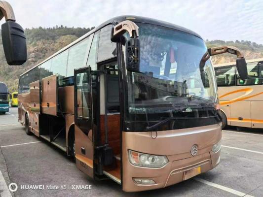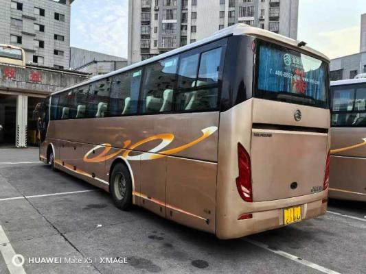 性价比极高国五50座一手旅游客车18 年 2 月上户厦门金旅 6122J15Y,50 座、国 5、玉柴 330-50,气囊悬挂、前碟后鼓、法士特变速箱、缓速器、暖风、空调、双开门、商务真皮座椅、电视、倒车影像、硬盘播放器、多功能方向盘、定速巡航、木纹地板--
