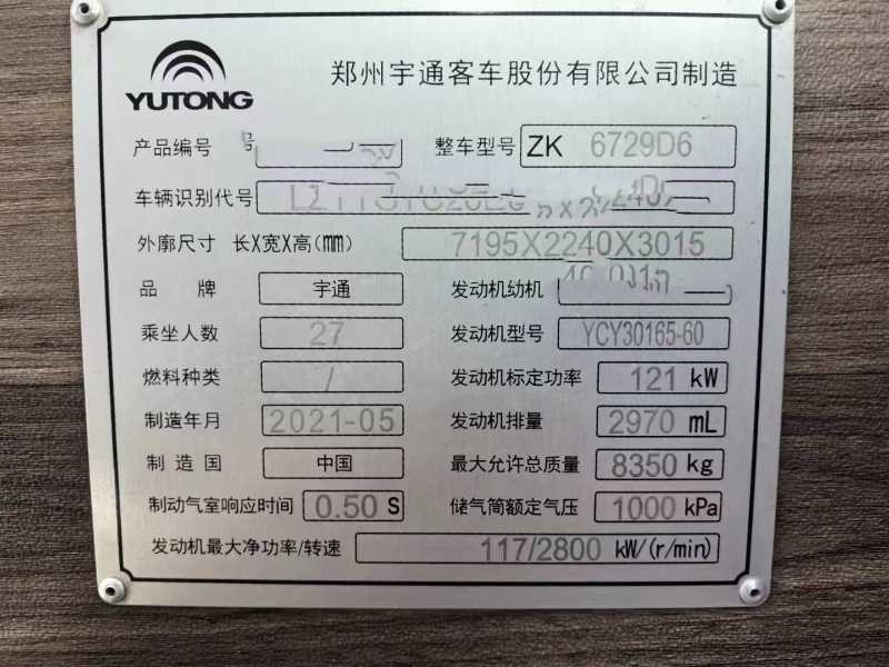 27座国六宇通6729,21年7月上牌,非营运有营运公告,下沉加大行李舱。玉柴165发动机。整车原版原漆。 手动6速.