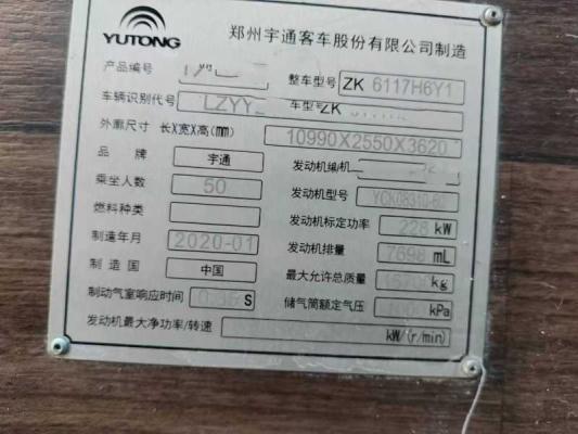 | 客车品牌 | 宇通客车 | 上牌时间 | 2020-01-07 |