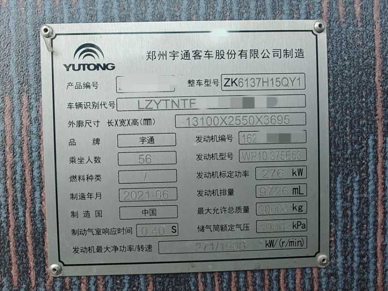 | 客车品牌 | 宇通客车 | 上牌时间 | 2021-07-28 |