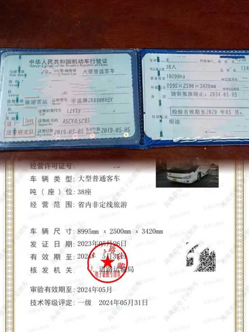 海南牌国五38座多台,宇通6906型有高级公告和营运转籍,2019年5月5日上牌,气囊车,玉柴6缸270机头,缓速器,豪华皮面软包座椅,木纹地板,安全门,一手旅游客运,内饰外观成色新,车8.995米长空间大,面向全国接受任意车型置换。