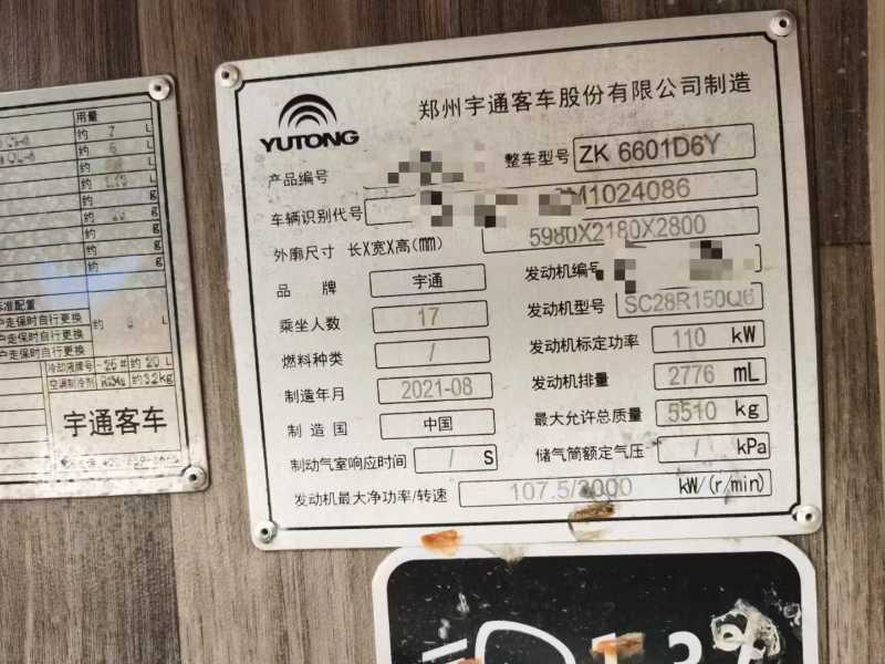 | 客车品牌 | 宇通客车 | 上牌时间 | 2021-10-11 |