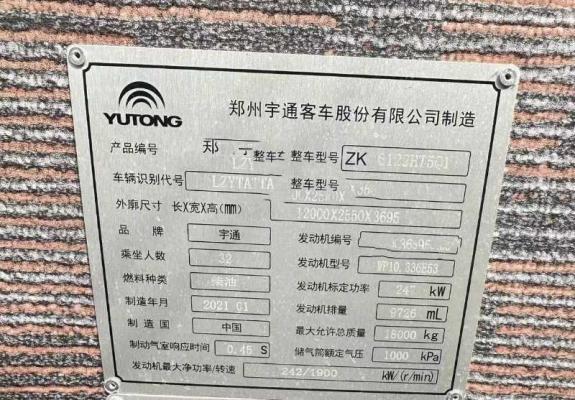 | 客车品牌 | 宇通客车 | 上牌时间 | 2021-01-12 |