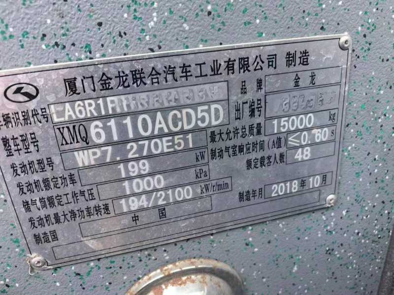 国五48座非营运有营运公告金龙6110客车,2018年11月,潍柴270发动机,非营运,有中门,有缓速器,单位一手车。公里数少,国5排放.有营运公告。
