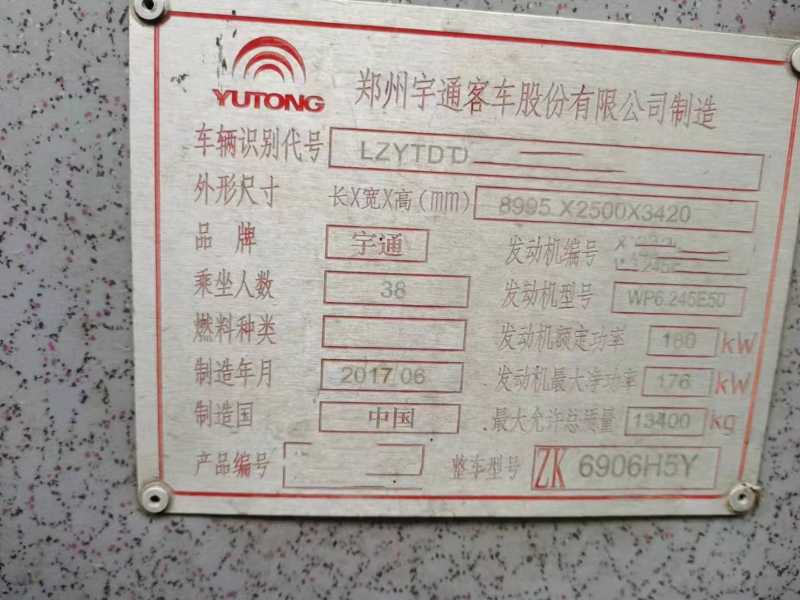 | 客车品牌 | 宇通客车 | 上牌时间 | 2017-06-22 |