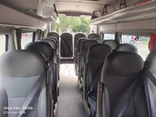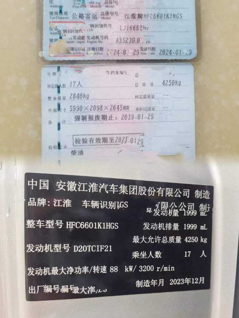 国六中型17座江淮营运车,2024年上牌6601型,手动柴油6个前进档,皮面座椅,行李架,天窗。