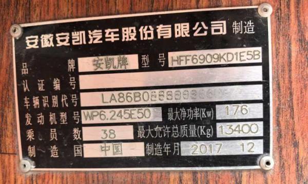 | 客车品牌 | 安凯客车 | 上牌时间 | 2017-12-20 |
