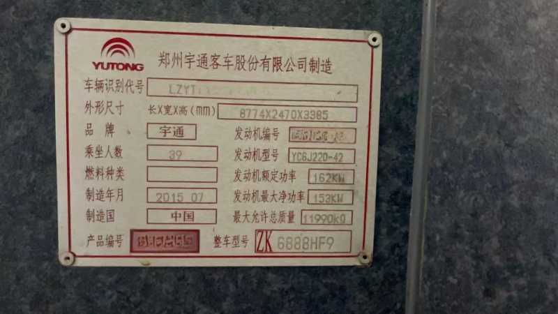 | 客车品牌 | 宇通客车 | 上牌时间 | 2015-08-18 |